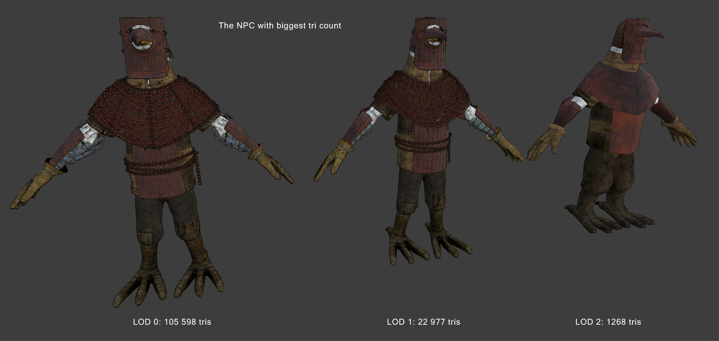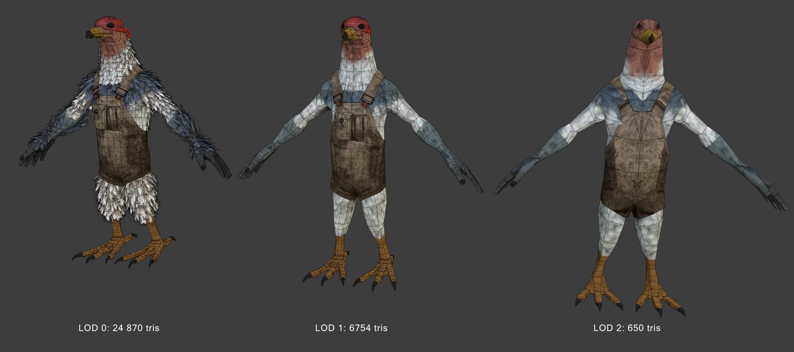 To reduce the likelyhood of that happening, I made LODs for some of the characters, with priority on those with a high polycount or ones that are numerous (enemies). To get the fade of Unity’s LOD Group working between the LOD versions, one can add a noise texture in the diffuse alpha and turn on Alpha Clipping in the material (at least in HDRP).