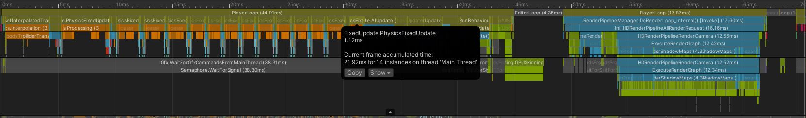 While looking at the profiler, I noticed there were the repetitive bars of FixedUpdate that seemed to form a big chunk of the time that GPU has to wait for commands from CPU. I had set the Fixed Timestep to be as little as 0.005 in an attempt to fix some occasional accidents of the rowboat shooting up in the air in build. By raising it to 0.02, I was able to largely remove that bottleneck from the process of rendering a frame and raise the frame rate by about 30%.