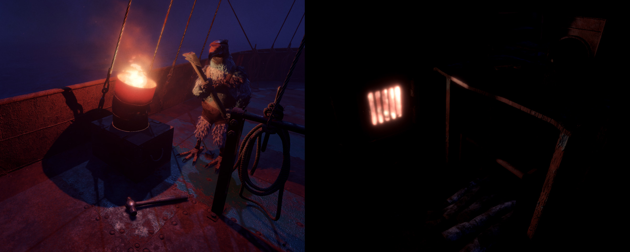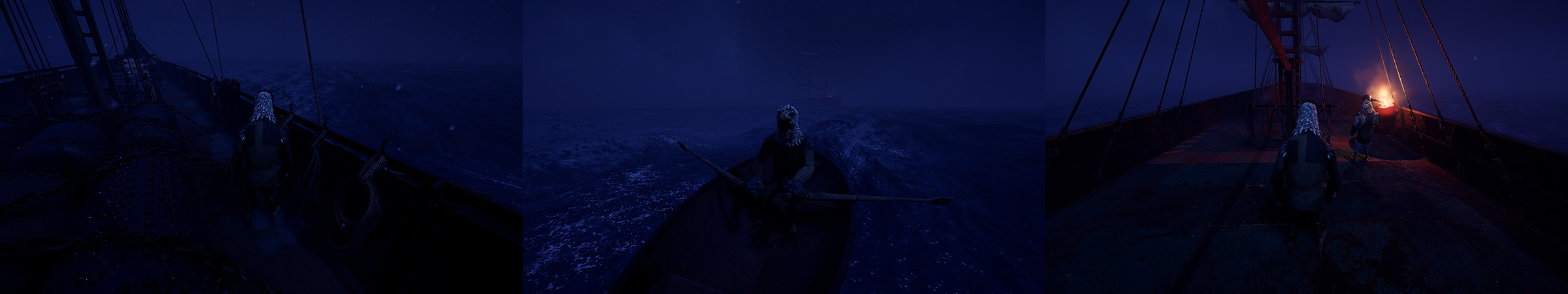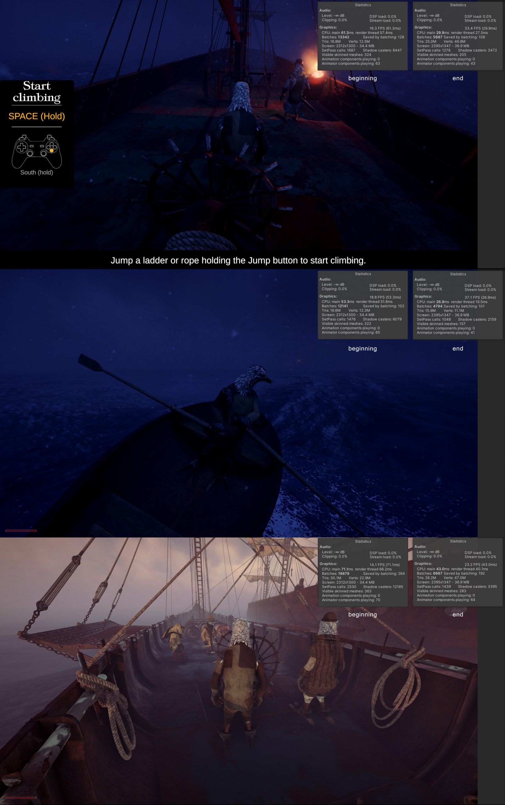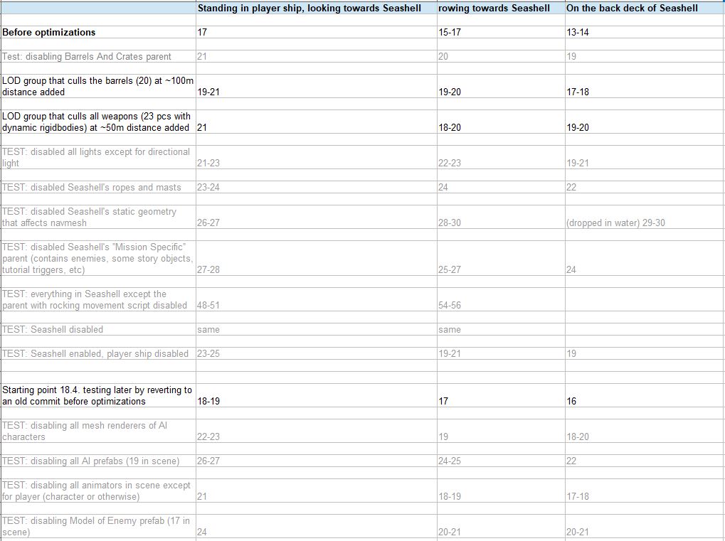 - unsurprisingly, the massive amount of game objects in the hull of ”Seashell”, a rocking ship that consists entirely of modular pieces and props seemed to have a big impact on framerate due to the huge number of draw calls and maybe the complexity of the hierarchy