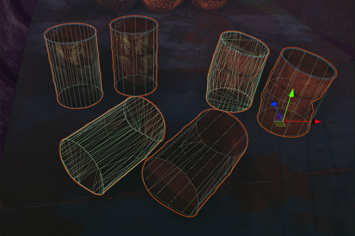 Another change that eased the burden of physics was changing some complex mesh colliders on rigidbodies to simpler colliders. The pushable crates were already OK as they had box colliders. For the barrels, I made low-poly mesh colliders with 40-80 tris.