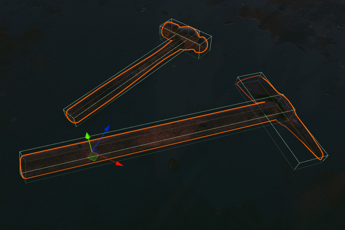 In optimizing colliders, it might be handy to keep in mind that a rigidbody combines the colliders in it children into a compound collider that has all the layers of the colliders, as long as the child colliders don’t have their own rigidbodies. This way you can build clusters of weird shapes even for the collider of a dynamic rigidbody, without it having to be convex like a mesh collider would. In the case of these tools, I put two box colliders directly in the rigidbody object though, since they’re so evenly shaped.